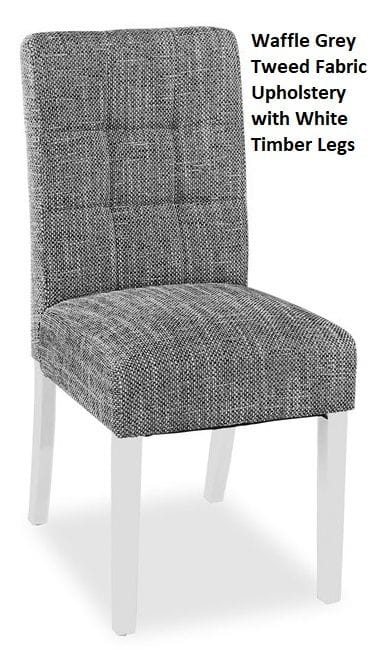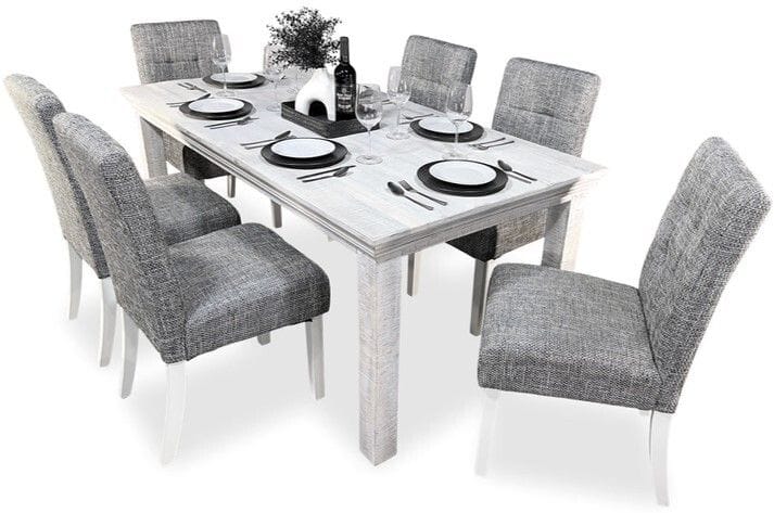 Sussex Dining Suite with Waffle Dining Chairs. Table offers a solid Mango Wood construction while the chairs have a solid Rubberwood frame & Tweed Grey fabric upholstery. Available in black & white finishes