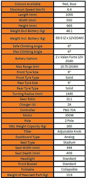 The Velira Lite is a compact and collapsible mobility scooter available in Deep Red and Dark Blue. It has a top speed of 6.4 km/h and features solid 9″ wheels front and rear. With dimensions of 1055 mm (L) x 550 mm (W) x 965 mm (H) and a turning radius of 1445 mm, it’s designed for easy manoeuvrability. The scooter supports lead-acid batteries 20Ah, offering a travel range of up to 15.75 km. It weighs 59.5 kg with 20Ah batteries, with a maximum user weight capacity of 160 kg. Other features include a 350W 2-pole motor, 2A charger, P&G 70A controller, adjustable knob tiller, analog controls, and a stadium seat with a 444 mm width. The total transport weight is 15.8 kg when folded.